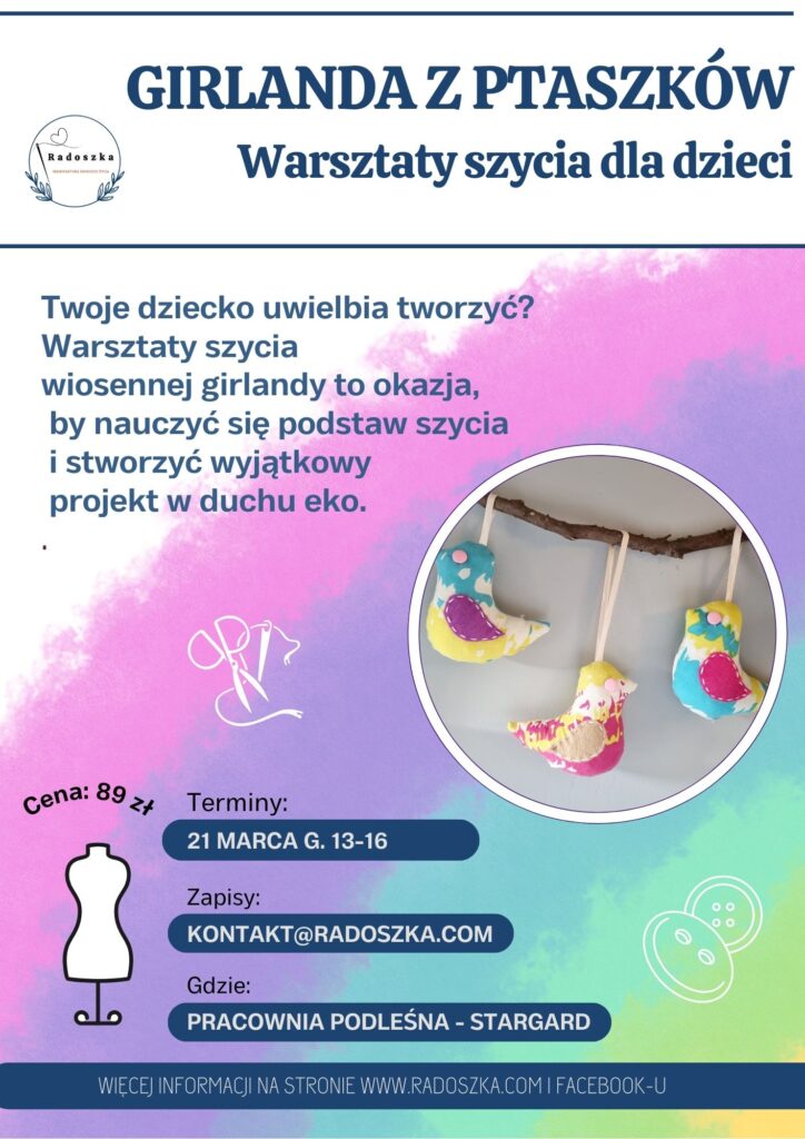 | Girlanda z ptaszków | 21 marca g. 13-16 | Dla dzieci od 8 lat | 99 zł | Podstawy obsługi maszyny do szycia Nauka szycia ręcznego (zszywanie, przyszywanie guzików) Po co nam wykrój? Szycie girlandy z 3 ptaszkami zawieszonymi na gałązce |