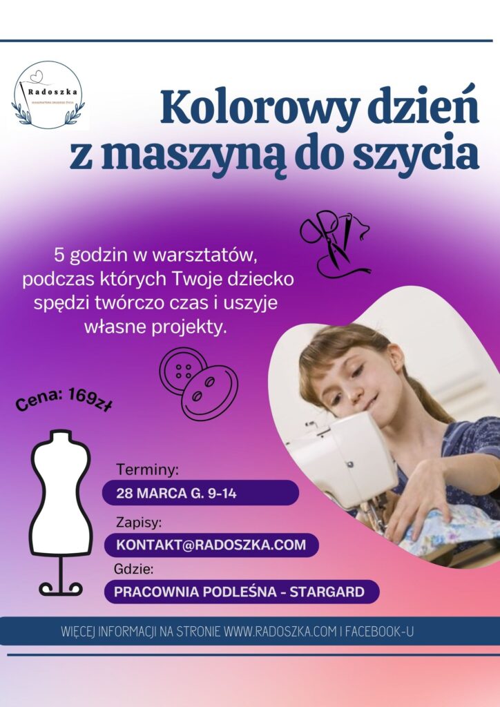 | Kolorowy dzień z maszyną do szycia (ostatnie 3 wolne miejsca) | 28 marca g. 9-14 | Dla dzieci od 8 lat | 169 zł | Obsługa maszyny do szycia Podstawowe umiejętności krawieckie Wybór materiałów i dodatków Szycie 2-3 wybranych projektów przez dziecko (poduszki, torby, akcesoria) |