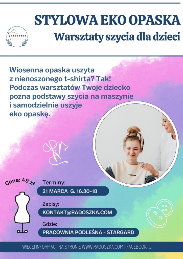 | Wiosenna eko opaska | 21 marca g. 16.30-18 | Dla dzieci od 8 lat | 49 zł | Podstawy obsługi maszyny do szycia Po co nam wykrój? Szycie dzianinowej opaski |